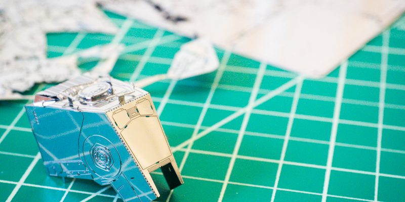To temper that feeling, I’m putting together an At-At figure from Metal Earth. Two flat sheets of thin metal with shapes cut out that, when put together, resemble a 3D object. Just what is needed! The kick in the pants is the little pieces are practically impossible to break away from the sheet without ruining both parts.